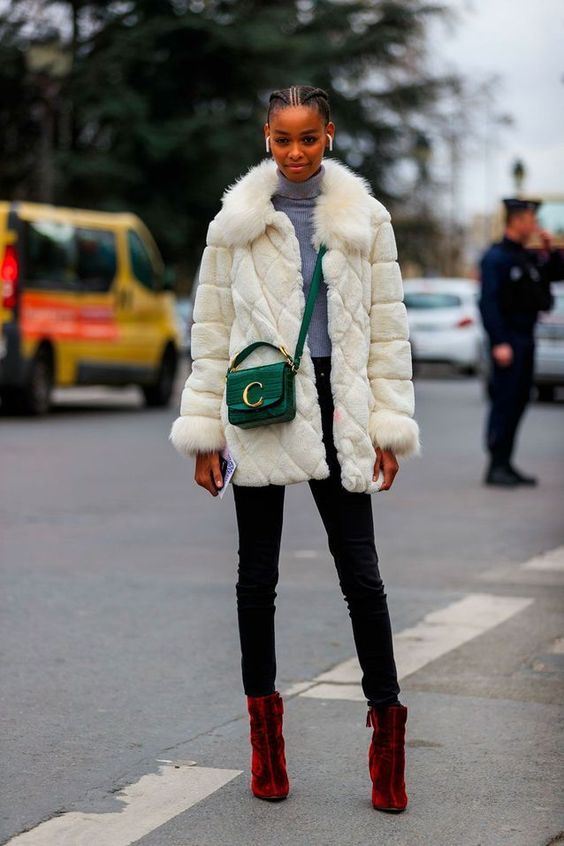 No importa el estilo que desees lucir, tu abrigo de pelo colorido podrá acompañarte tanto de día como de noche. Por ejemplo, para un estilo audaz, elige una faux piel corta y roja. Combinada con un vestido de punto negro y un par de tacones, serás inevitablemente la reina de la noche.