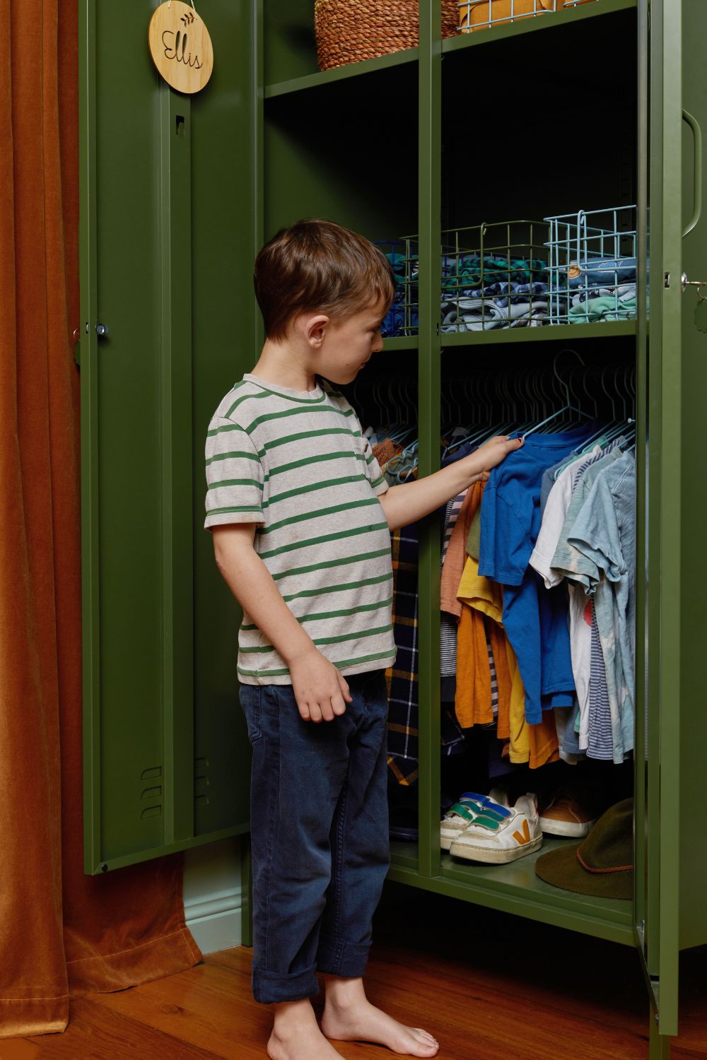 Un vestuario reducido ofrece una claridad inmediata. Las elecciones se hacen más rápido, las combinaciones se vuelven instinctivas, el almacenamiento se simplifica. El niño gana en autonomía, las mañanas se vuelven más fluidas y la relación con la ropa se calma.