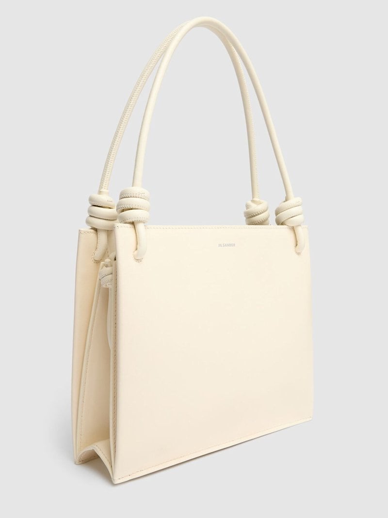 Parece simple, pero sus detalles lujosos lo hacen único. Fabricado en Italia, este bolso color huevo se distingue por sus cuatro nudos en las asas, que aportan un toque original a su diseño minimalista.